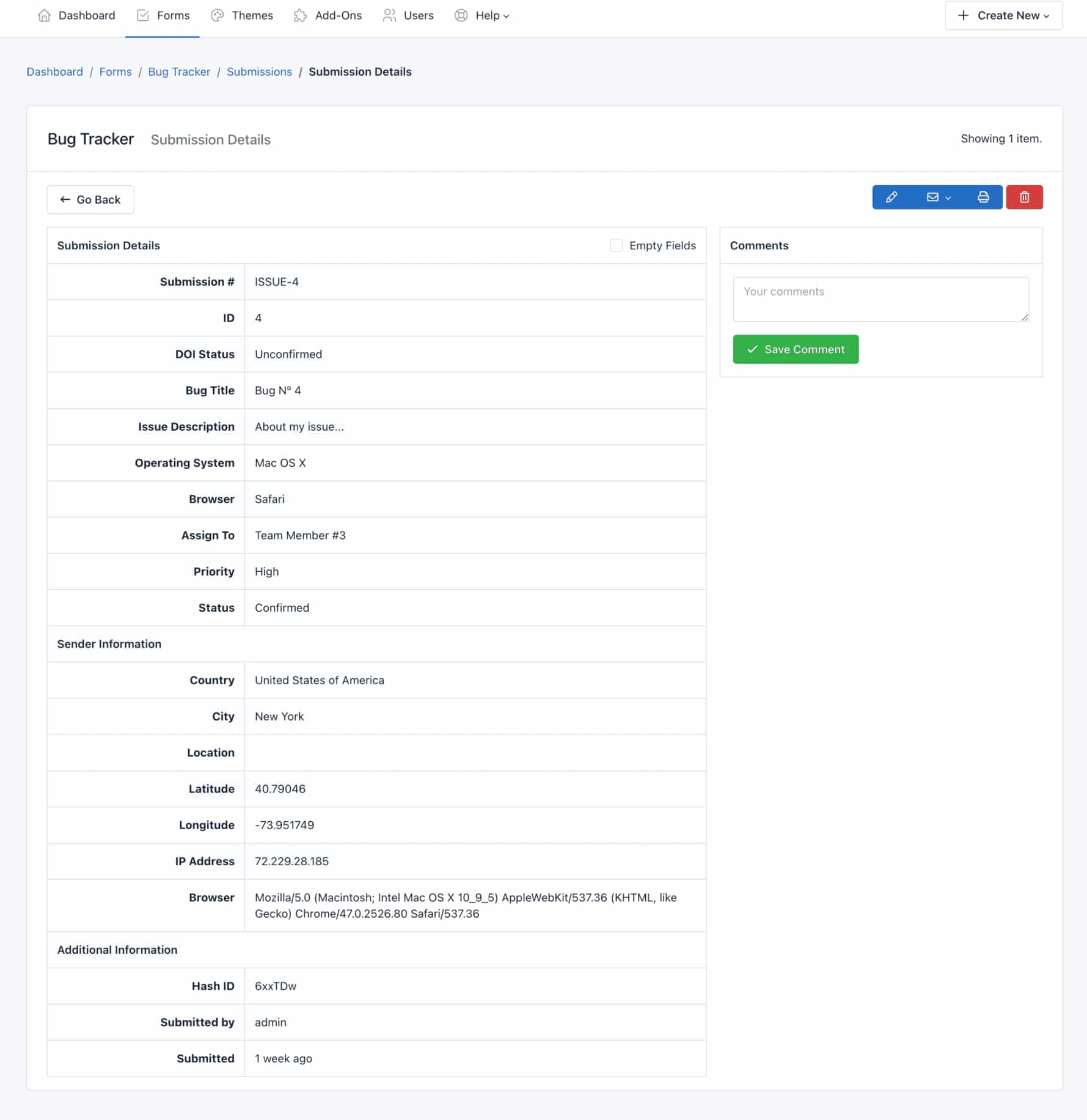 - Additional Information: Displays the Hash ID of the Form Submission. If Submissions are editable (See: Form Settings), a link to the form page to edit this entry will appear. You can share this link with your end-users to allow the edition. Also, in this section you can see the date when the Submission has been sent or updated and if it was made by a logged-in users, his username will appear.