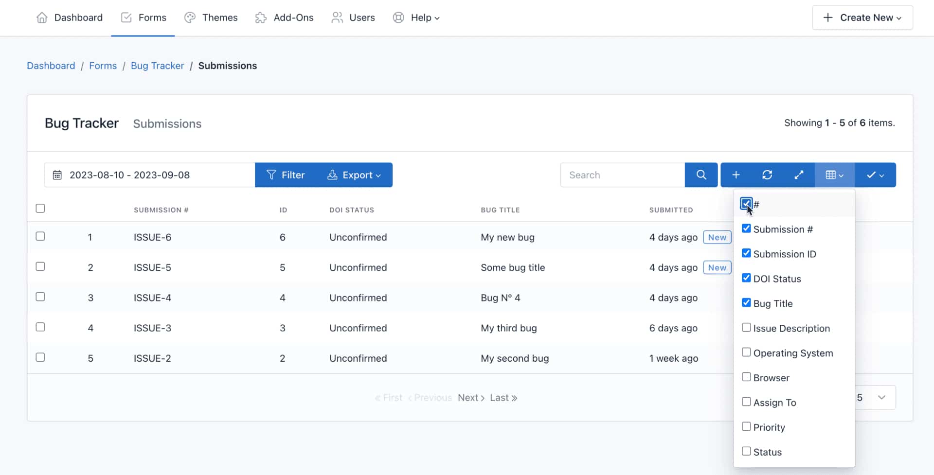 DOI Status: This is a special column that shows when a form submission has been confirmed or not.
